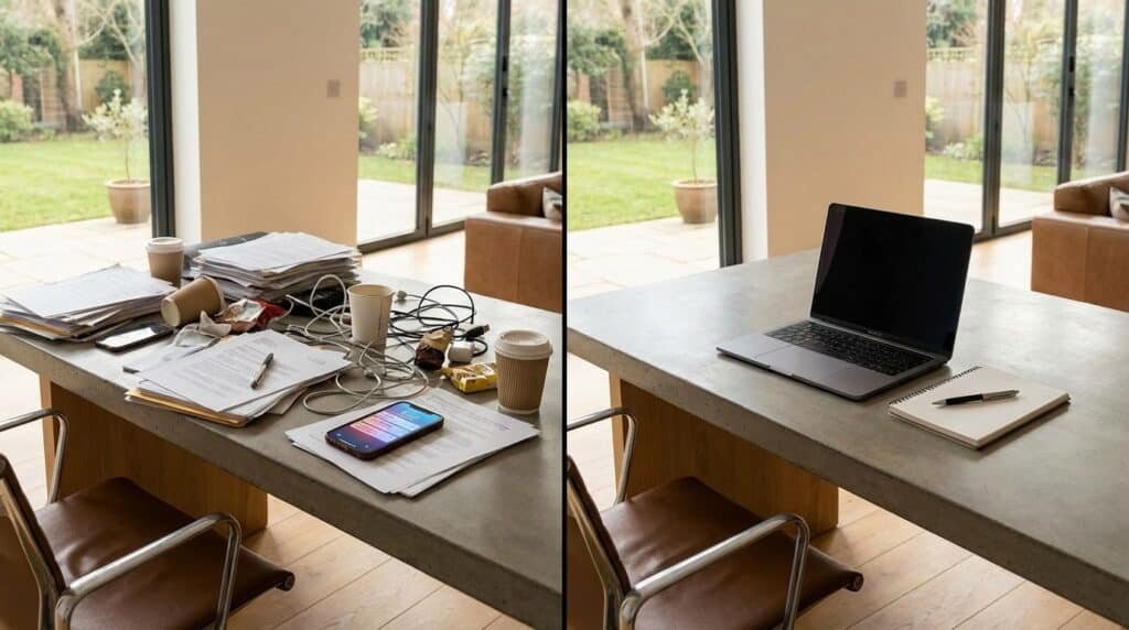 Un bureau épuré apaise immédiatement le système nerveux et favorise l’immersion.