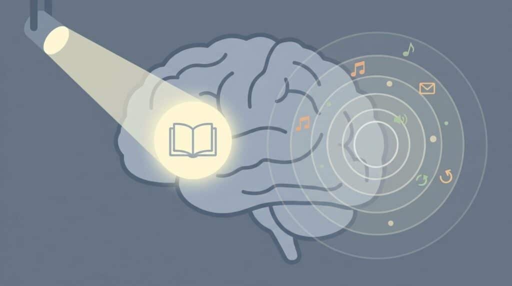 - Le Projecteur (Votre focus) : C’est vous qui le dirigez. Quand vous décidez de lire un rapport ou de répondre à un client, vous braquez toute la lumière sur cette tâche. Tout ce qui est autour (le bruit des collègues, la météo) reste dans le noir.