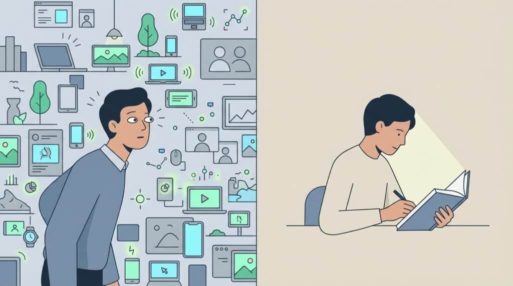 Dans un environnement stable, votre cerveau favorise naturellement l’exploitation. Mais dans un monde saturé de signaux — notifications, alertes, flux continus — chaque signal de « nouveauté » active votre circuit de la récompense et force votre esprit à basculer vers l’exploration. Ce n’est pas un manque de volonté de votre part, mais une réponse automatique de votre système d’alerte. Ce déséquilibre permanent fragilise votre capacité à maintenir un focus durable et vous maintient dans un « mode scan » épuisant.