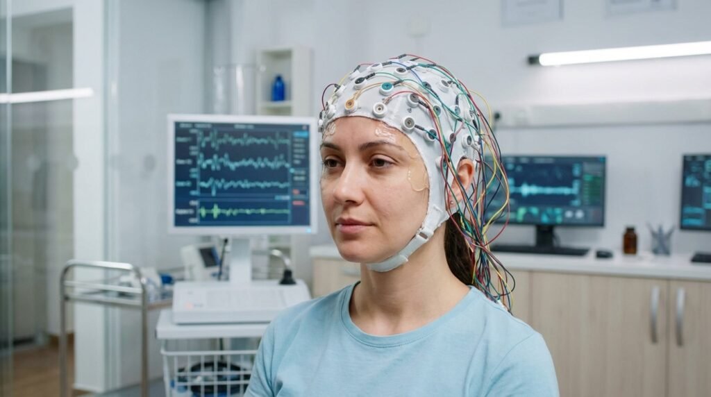 - Le principe : Les neurones communiquent par de faibles courants électriques. En recevant des capteurs sur le cuir chevelu, on enregistre cette activité sous forme d’ondes.
