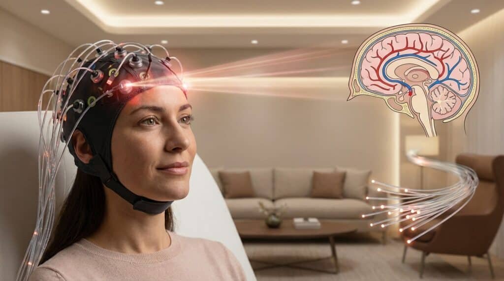 - Comment ça marche : On place un bonnet muni de fibres optiques sur la tête. L’appareil envoie une lumière infrarouge inoffensive qui traverse la peau et l’os. Le sang oxygéné absorbe cette lumière différemment du sang non oxygéné.